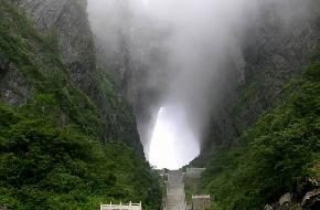 天門洞在天門山1264米高的絕壁之上,生出一個南北洞穿的天然門洞,洞底至洞頂131.5米,寬37米,縱深30 米。洞北面頂部邊緣,有倒垂的龍頭竹,它的根像龍頭,樹葉像鳳尾,因此又叫鳳尾竹。東側(cè)是高約200多米的溝槽,有泉水從上面飄散,落下點(diǎn)點(diǎn)梅花雨。據(jù)說誰能張口接下48滴梅花雨,便可羽化成仙。天門洞口,經(jīng)常能看到巖燕飛舞,山鷹盤旋。隨著天氣的變化,天門洞有時候吞云吐霧,有時候明朗似天門山國家森林公園鏡,構(gòu)成循環(huán)往復(fù)、瞬息萬變的氣象景觀。